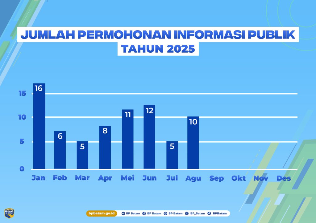 Selama tahun 2025 (Januari – Agustus), PPID di lingkungan BP Batam menerima 73 permohonan informasi yang berasal dari berbagai kalangan masyarakat seperti pelajar, mahasiswa, karyawan swasta, PNS, advokat, pengacara, dan masyarakat lainnya. Gambar di bawah ini akan menjelaskan jumlah permohonan yang diterima oleh PPID BP Batam setiap bulannya selama tahun 2024.