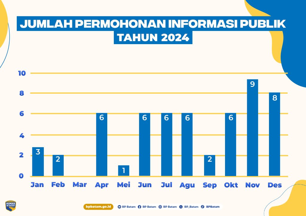 Selama tahun 2024 (Januari – September), PPID di lingkungan BP Batam menerima 54 permohonan informasi yang berasal dari berbagai kalangan masyarakat seperti pelajar, mahasiswa, karyawan swasta, PNS, advokat, pengacara, dan masyarakat lainnya. Gambar di bawah ini akan menjelaskan jumlah permohonan yang diterima oleh PPID BP Batam setiap bulannya selama tahun 2024.
